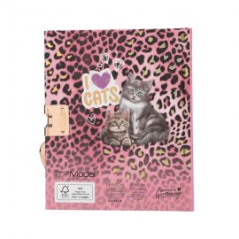 Un set de TOPModel para pensamientos íntimos y secretos. El diario, con colorido estampado animal print y una guapa modelo en la portada, lleva un bonito candado con forma de corazón e incluye dos llaves. El interior consta de páginas con pauta de líneas finas. El bolígrafo a juego escribe con tinta invisible que solo podrá verse al iluminarla con la luz UV del diamante que remata el bolígrafo como topper. Nuevo: las pilas del bolígrafo son recambiables.