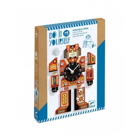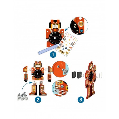 Con un lápiz, el niño frota las calcas para trasladarlas a las 5 piezas de cartón resistente que conformarán el reloj. Luego atornilla los tornillos para montar el robot. Ya solo queda montar el mecanismo. Un bonito reloj con forma de robot, que tu hijo estará orgulloso de colgar en su habitación para decorarla. Una actividad manual 2 en 1 que combina calcomanías y montaje.