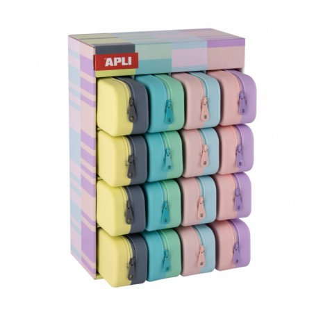 Cada expositor contiene 16 estuches de tamaño 75 x 185 x 55 mm. Disponible en 4 colores surtidos: azul y amarillo, azul y verde, azul y rosa, y lila y rosa.