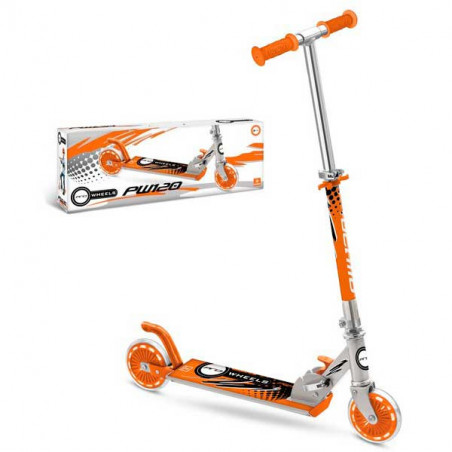 Patinete de 2 ruedas de aluminio en tonos naranja y gris.