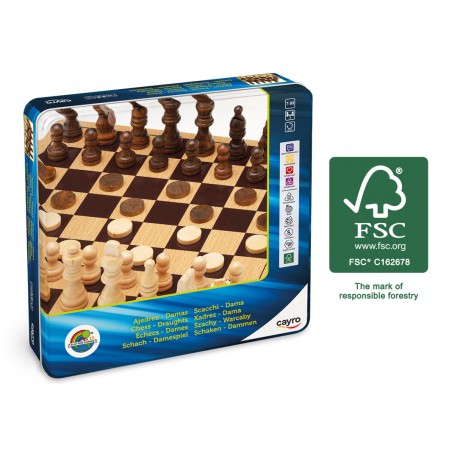 Juega al Ajedrez o a las Damas, lo que más rabia te de. Es de madera, tanto el tablero como las fichas. Y después para guardarlo tienes la caja de metal. ¿Alguien recuerda cuando nuestras madres guardaban galletas o hacían la caja de costura con estas cajas metálicas?