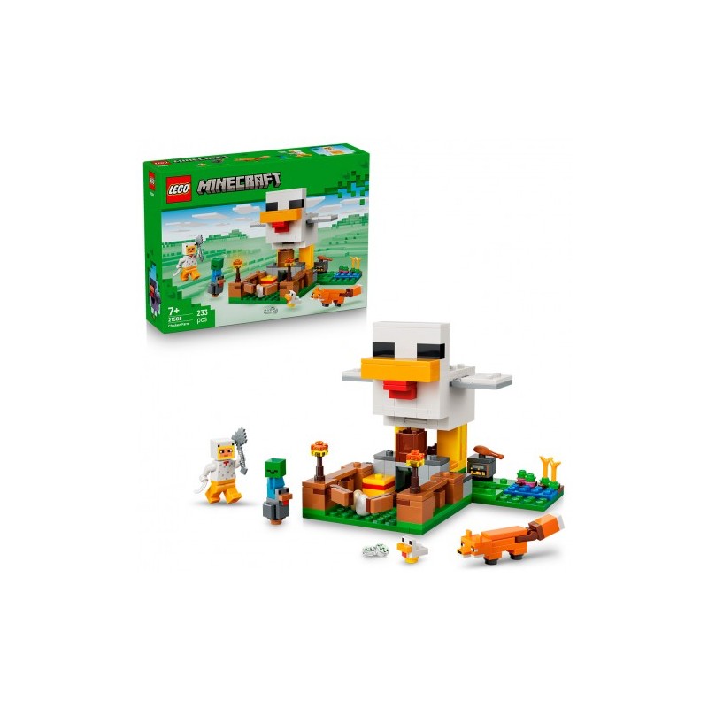 Este set de construcción desafía a los jugadores a cuidar de una gallina fría y una gallina bebé con una minifigura del Fan del Pollo mientras se enfrentan a un zorro (a quien le gusta comer gallina fría) y un zombi bebé (a quien le gusta hacer de jinete a lomos de las gallinas). El gallinero de juguete tiene forma de gallina con alas móviles y un corral delante con una puerta que se abre. La gallina gigante pone huevos y también vierte semillas por la boca en un contenedor que se inclina cuando las gallinas necesitan comida. Incluye divertidos accesorios: antorchas, heno, un ahumador, 2 huevos, 2 montones de semillas, un muslo de pollo, una pluma y un hacha. El set contiene 233 piezas.