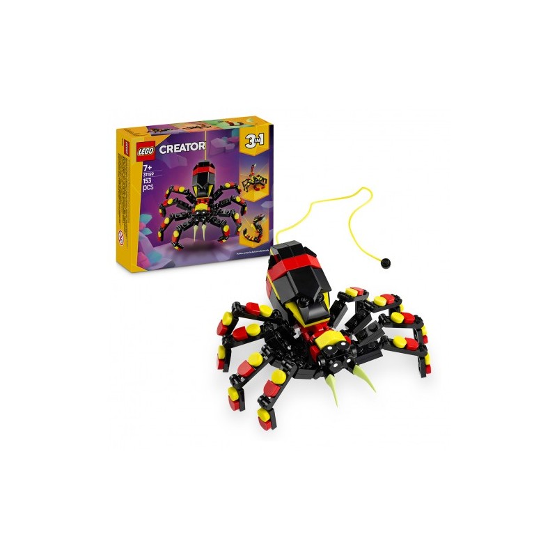 Los niños y las niñas descubrirán criaturas fascinantes con el juego Fauna Salvaje: Araña Misteriosa. La colorida araña tiene 8 patas articuladas, grandes dientes y una telaraña amarillo neón que le sale del abdomen para colgarla de un ladrillo LEGO y jugar con ella o exponerla. Los apasionados de los animales asombrosos pueden construir 3 modelos diferentes con el mismo conjunto de ladrillos: una araña LEGO articulada con un hilo de telaraña extensible, una figura articulada de un escorpión o una majestuosa serpiente de juguete articulada. Las 3 figuras de este juguete transformable son regalos muy divertidos y creativos.