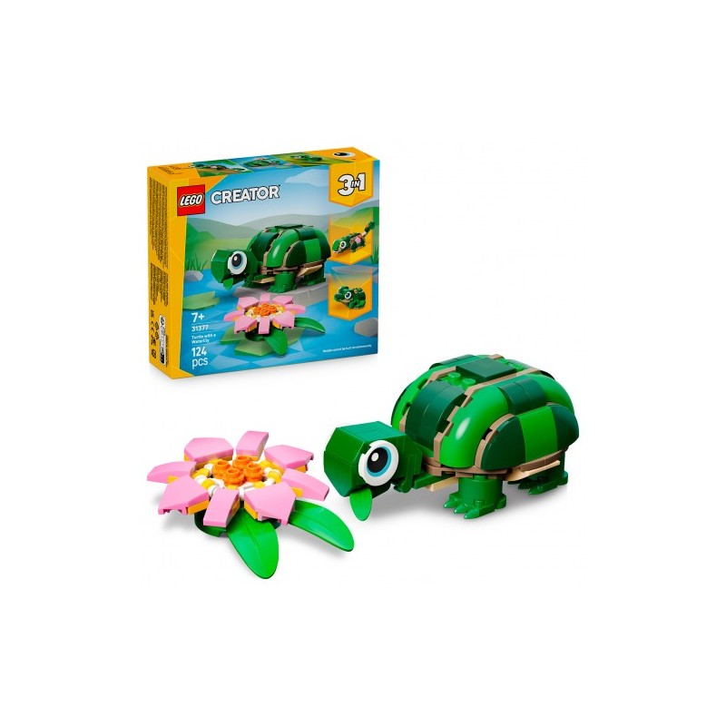 El set de construcción LEGO Creator 3 en 1 Tortuga con Flor de Nenúfar les permite interpretar creativas historias con animales. Este simpático juguete ofrece 3 opciones de construcción diferentes con los mismos ladrillos. Los peques pueden construir una tortuga de juguete con cabeza y boca articuladas, así como la preciosa flor de nenúfar rosa que la acompaña, y luego convertirla en un camaleón de juguete con cabeza y cola articuladas o en una rana de juguete con boca móvil. El set contiene 124 piezas.
