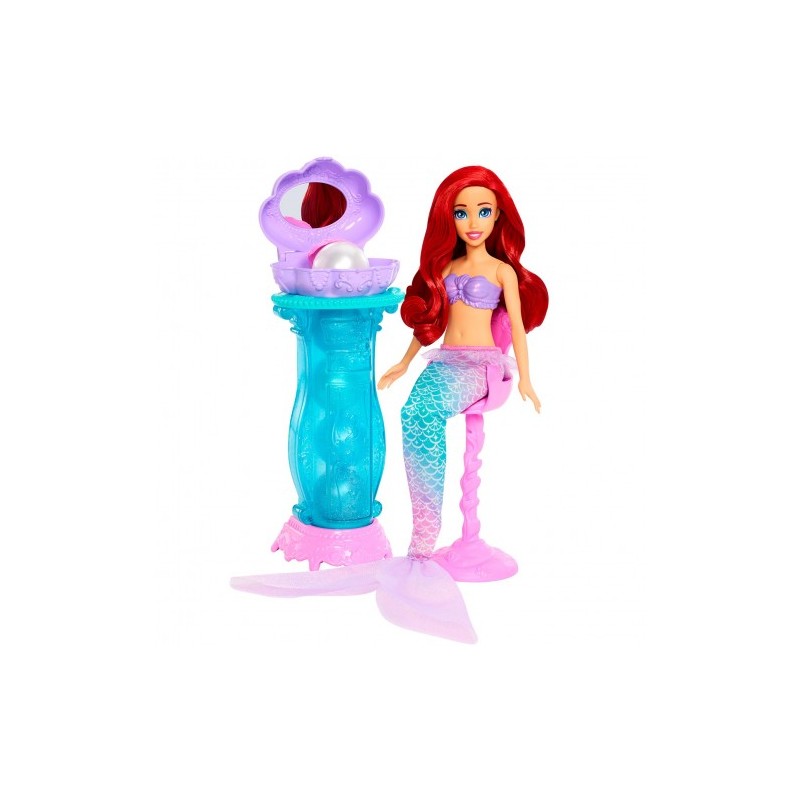 Inspirada en el querido personaje de Disney, la muñeca de Ariel lleva una suave cola de sirena extraíble y tiene una melena con la que puedes divertirte peinándola. El tocador con temática marina contiene cinco perlas, cada una con un accesorio único sorpresa. Solo tienes que abrir el tocador para que comiencen las mágicas sorpresas. Los accesorios sorpresa incluyen una tiara, un collar y un lazo para el pelo con un cachivache, ¡todo lo que necesitas para peinar a la muñeca Ariel y llevarla a vivir aventuras en tierra y mar!