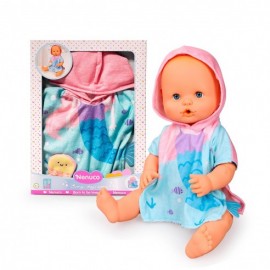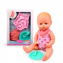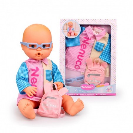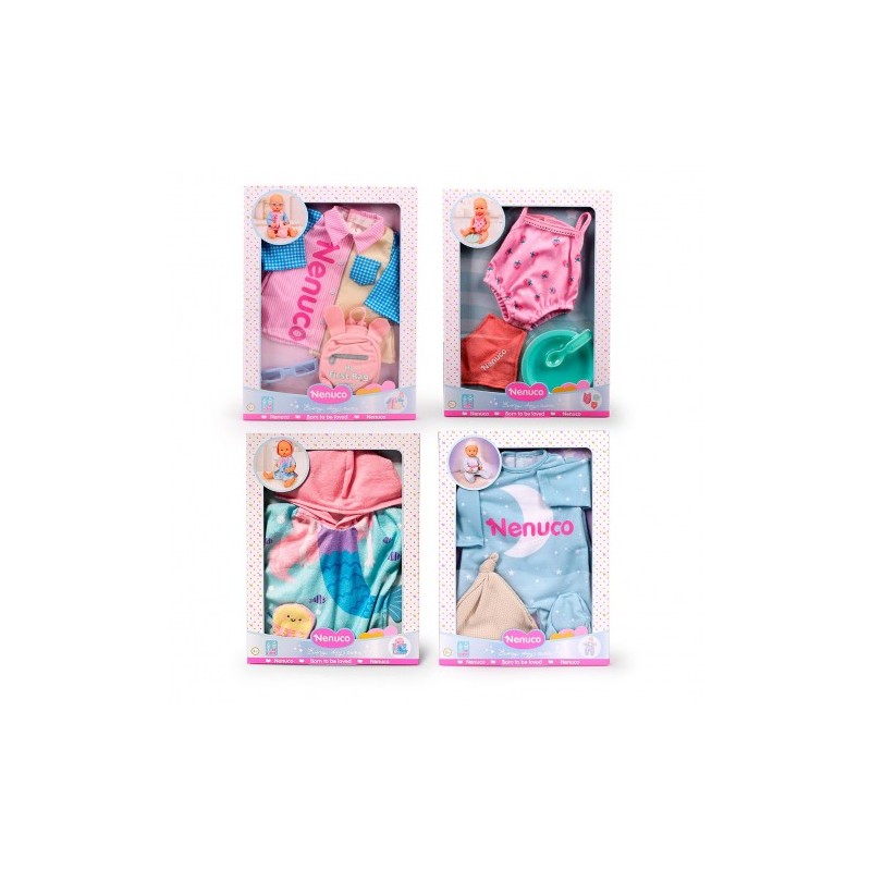 Surtido de 4 conjuntos de diario para Nenuco de 42 cm. Para el momento de la comida, body con babero y platito con cuchara; para el baó, toalla con capucha de sirena; para dormir, pijama y gorrito; para el cole, baby, mochila y gafas.