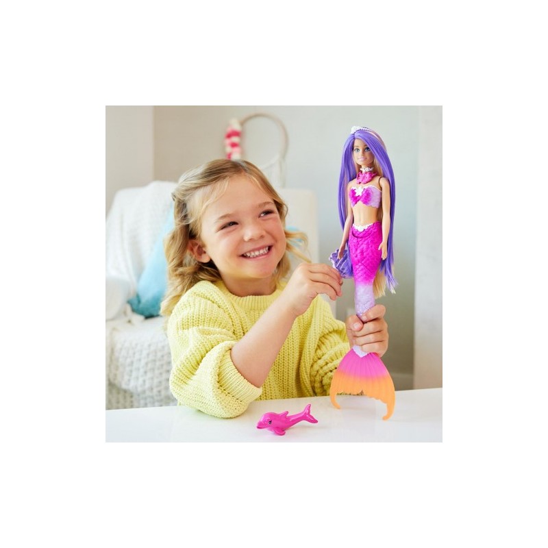 ¡Esta muñeca Barbie sirena transforma el tiempo de juego en pura magia con sus funciones de cambio de color! Como encantada por los poderes submarinos, el cabello súper largo, el corpiño esculpido y la cola de la sirena cambian del rosa chicle al púrpura vibrante y viceversa. Barbie 'Malibu' viene con accesorios de peinado, un cepillo y una adorable mascota.