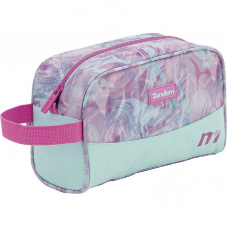 Neceser con un compartimento grande de apertura superior con cremallera. Dispone de dos asas: Una ubicada en un lateral facilitando el agarre y la otra es una banda trasera, la cual permite adaptarse a las barras de un carro de mochila o de maleta. No ocupa mucho espacio dentro de una mochila, bolso o maleta.