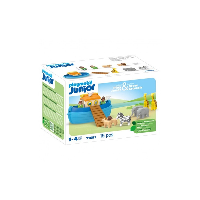 Arca flotante con asa de transporte en el techo. El techo de la casa se puede abrir para jugar más fácilmente. Las figuras y los animales se pueden guardar en el cuerpo del arca para un transporte seguro. Juguete con 90% material de origen vegetal.