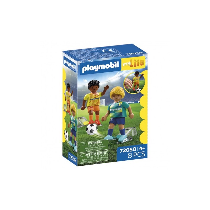 ¡Nuevos jugadores para aún más diversión en el fútbol! Dos nuevos jugadores de fútbol salen al campo. Ya sea que te unas durante el entrenamiento o aumentes a uno de los equipos en el Playmobil Soccer Arena, estas figuras de PLAYMOBIL también pueden patear la pelota. Simplemente tira de la pierna hacia atrás, apunta y dispara. Pases geniales y tiros precisos en la portería son parte del juego. Con la hoja de calcomanías incluida, los niños pueden personalizar a sus jugadores añadiendo sus propios números de jersey, en la camisa y pantalones cortos.