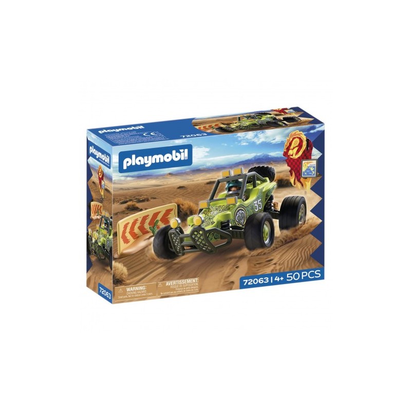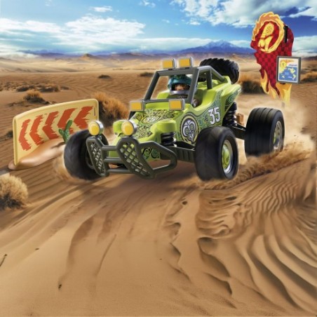 El buggy avanza por el desierto chileno gracias a su suspensión trasera. La rueda de repuesto permite cambios rápidos, y las lámparas del parachoques facilitan la conducción nocturna. Con herramientas, bidón, mapa y walkie-talkie, la aventura es total.