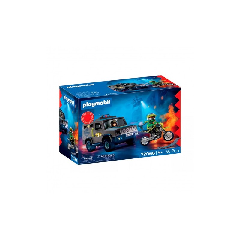 Las luces parpadean y los motores rugen mientras la persecución se convierte en un enfrentamiento a toda velocidad. Con tácticas precisas y equipo potente, la unidad especial de PLAYMOBIL acorrala al criminal, transformando cada momento en pura emoción. Los niños pueden montar bloqueos audaces, capturas valientes y escenas llenas de trabajo en equipo. Este detallado set de PLAYMOBIL incluye un agente SWAT, un criminal, un vehículo con techo desmontable, puertas traseras que se abren, barra de luces intermitentes, una moto, una tira de clavos, esposas y mucho equipo para aventuras dinámicas.