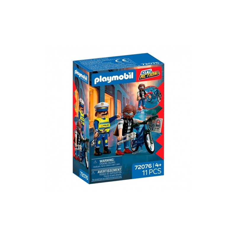 ¡Atrapado en el acto! El ladrón de bicicletas acaba de romper el candado de la bicicleta con un cortapernos e intenta escaparse pasando desapercibido. No obstante, el atento policía lo ha visto todo y le detiene enseguida. El candado de la bicicleta se convierte rápidamente en unas esposas para arrestar al delincuente. Este set de PLAYMOBIL incluye un agente, un criminal, una bicicleta, un casco policial, un mapa y unas versátiles esposas que también funcionan como un resistente candado para la bici, ¡para un juego dinámico!
